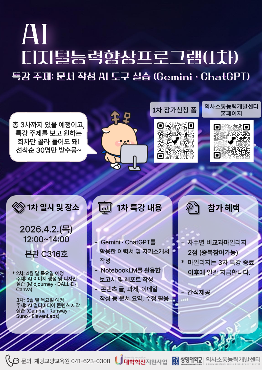 천안 [비교과] [의사소통능력개발센터(천안)] 2026-1 AI 디지털능력향상프로그램(2차) 참여자 모집 -